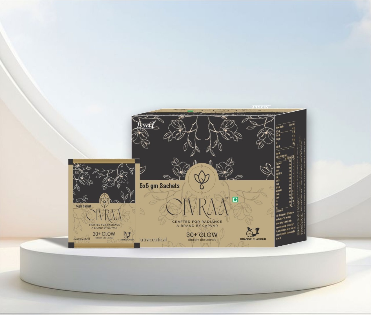 CIVRAA 30+ Glow Sachets combine Ayurvedic herbs, antioxidants, and essential nutrients to support skin, hair, nails, energy, and overall women’s wellness – all in a refreshing orange flavour.